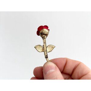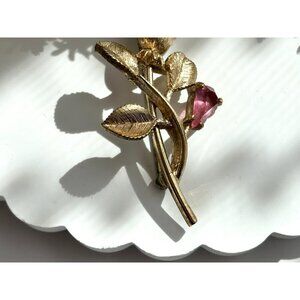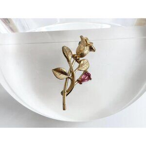 Avon signed gold toned textured vintage brooch. The brooch features a lavender colored rhinestone at the right of the brooch. The leaves and rose are all gold toned. Gorgeous piece in good condition. The enclosure is sliding c clasp style.