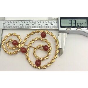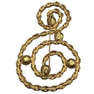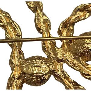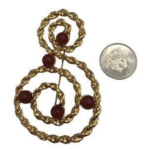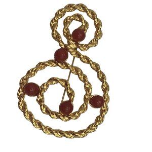 This stunning brooch features a round cabochon of Carnelian-color Lucite, set in a frame of twisted rope design gold-tone metal. The brooch measures 3.3 inches long. Marked ©AVON on the reverse. Finished with a secure locking pin the functions properly and is in good vintage condition. This a perfect piece for AVON vintage costume jewelry collectors.