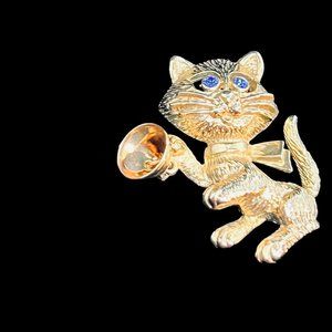 Avon Gold Tone Cat Brooch With Blue Rhinestone Eyes And With Articulating Bell.