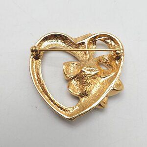 This elegant gold-tone brooch features a heart design with a delicate floral accent, highlighted by a central rhinestone. It adds a touch of sophistication to any ensemble, making it an ideal accessory for business attire or formal occasions.