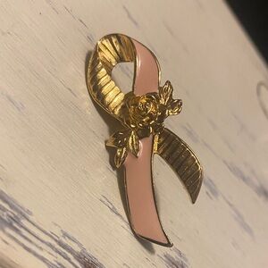 Vintage Avon! Charming brooch with gold and pink ribbon design. Features a delicate floral accent.