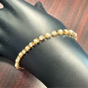 This exquisite Avon bracelet showcases a harmonious blend of goldtone along with crystals and clear gems, crafted into a sleek and sophisticated design. Its slim profile and elegant pattern make it a versatile accessory, perfect for enhancing both formal and casual ensembles. The bracelet's refined craftsmanship ensures it fits comfortably around the wrist, adding a touch of timeless elegance to any occasion.