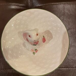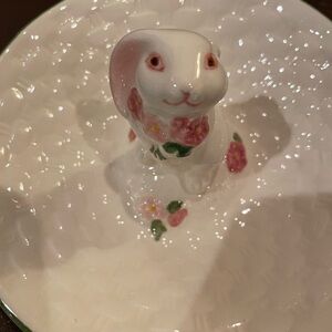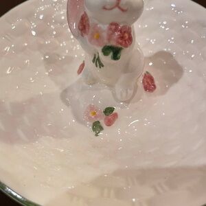 This Vintage 1982 Avon Hand Painted Porcelain Round Trinket or Candy Dish with Bunny Rabbit beautiful Vntg dish in good shape