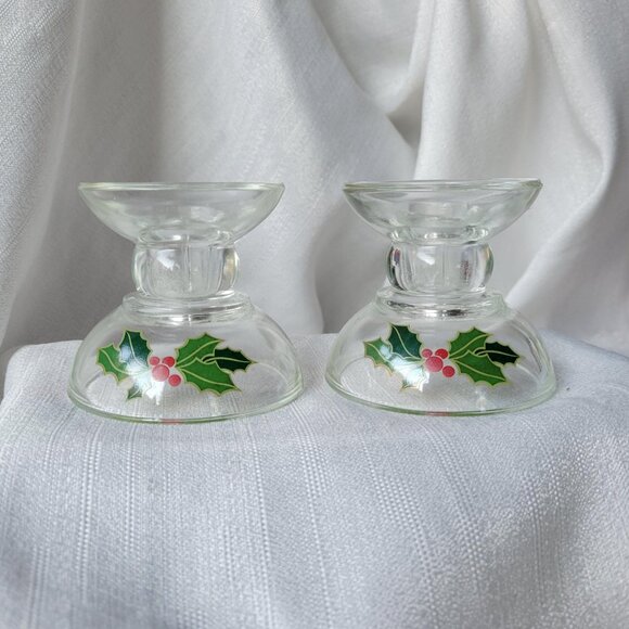 A vintage set of 2 Avon glass candlesticks from 1981. These lovely candlesticks have holly leaves and berries painted on them. They are meant to hold taper candles but if turned upside down could hold a votive candle. They come in the original box from Avon which does show wear after 44 years. The candle holders are in excellent condition with no scratches on the paint and no cracks or chips.