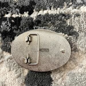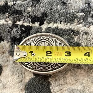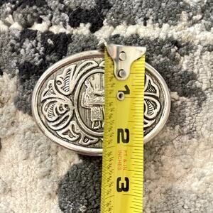 This is a vintage Avon belt buckle featuring a detailed western design with a saddle in the center. The buckle has a filigree-style border and an overall silver-tone, possibly pewter-like, finish. The back is marked with the Avon name. Based on the measurements, it is an oval shape, measuring approximately 3 inches wide and 2.5 inches tall. It is in gently used condition.