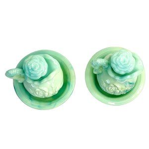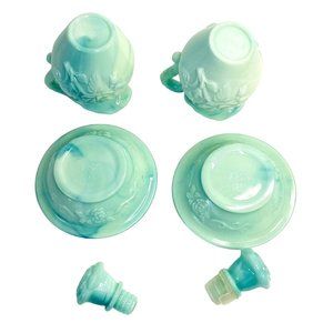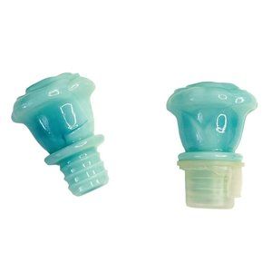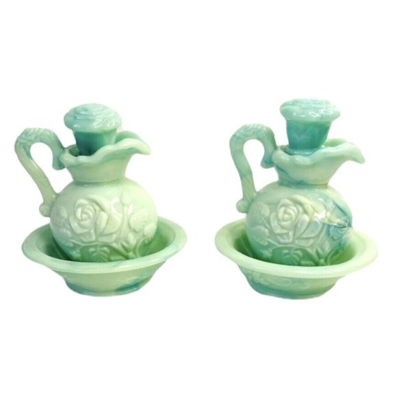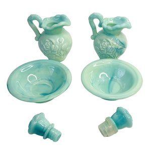 Pair of 2 Vintage Avon Decanter Pitcher Bottles, Bowls and Stoppers 5" Turquoise Colored Jadeite Glass All Glass is in Perfect Condition With no Cracks, Chips or Crazing. Both Bottles Include Their Stoppers but one Stopper is Missing the Rubber Seal. Otherwise they are in excellent condition. Please See my Photos.