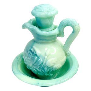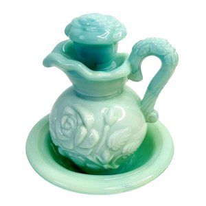 Avon Jadeite Decanter Bottle Pitcher and Bowl w/ Stoppers 5" Victoriana Glass