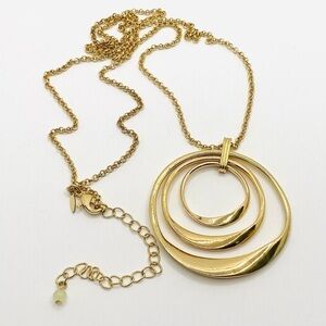 A beautiful necklace on the gold tone chain features three orbits modern necklace.
