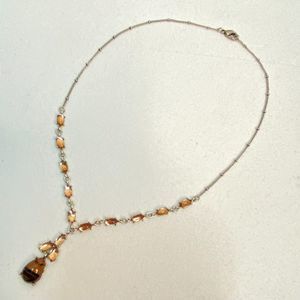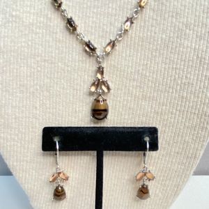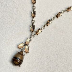 Avon Necklace Earrings Demi Parure Central Brown Golden Oval Stones Silver Chain