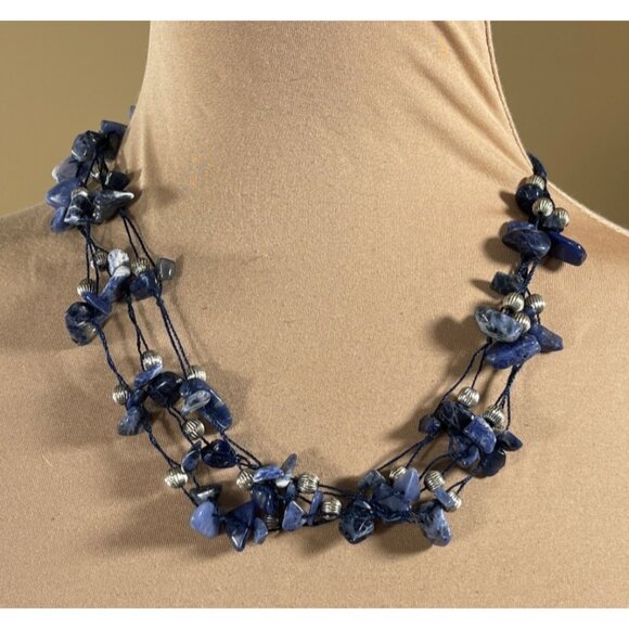 Avon Necklace Multistrand Blue Stone Chips Chunky Silver Beads Statement