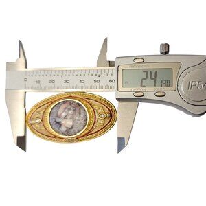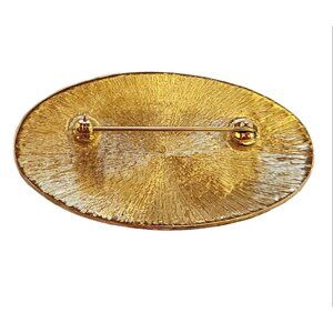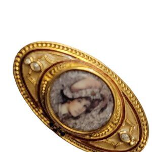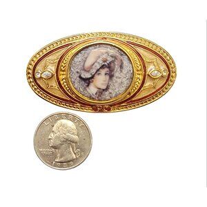A stunning brooch that has a vintage aesthetic style in its entirety. This Vintage Avon late 90s President’s Club brooch features the very first Avon lady, Mrs. Albee. Oval-shaped pin of gold-tone designs, the centerpiece is a portrait of an Edwardian Lady. Decorated with clear rhinestones in round and marquise shapes on both sides. Measures approximately 2.4 inches in width and 1.3 inches in length. Marked PC on an oval cartouche upfront. Features a locking pin that is sturdy and secure, allowing the piece to be easily attached to clothing or accessories.
