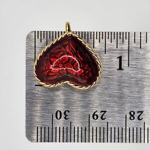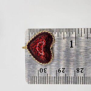 Beautiful Avon clip-on earrings features a deep red puffy heart trimmed with a gold-tone rope design. A floral design is embedded in the heart. There is some verdigris on the back, but otherwise they're in great condition.