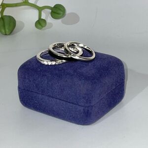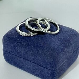 This exquisite Avon ring set showcases a timeless design with its Triple silver bands and striking black and rhinestone accents. The set features one ring of sparkling stones set in a pavé style, creating a dazzling effect. Perfect for special occasions, this piece adds a touch of elegance and sophistication to any ensemble.