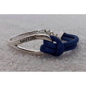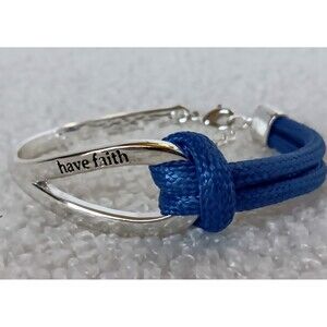 Avon Signed SAQ Silvertone & Blue Cord "Have Faith" Bracelet 6.5-7.5 in