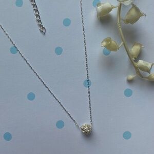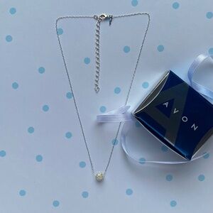 This is a silver tone Shimmering rhinestone necklace by Avon. Beautiful delicate silver tone chain with a small ball of rhinestones! The Avon trademark is stamped on the hangtag. The chain is 16" with an extra 3" extension chain. Necklace comes packaged in original box.