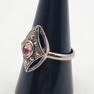 Avon silver tone diamond shaped ring with Marcasite and pink cubic zirconia.