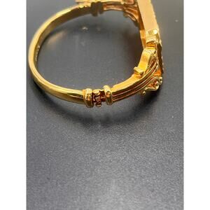 The bracelet is designed in a gold tone metal with white/clear rhinestones, exuding beauty and elegance with its historical theme. It comes in its original box, making it a unique and collectible piece for any jewelry enthusiast or vintage jewelry collector.