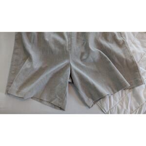 Good used condition. Some minor pilling in the thigh area. Pleated pull on shorts with elastic waistband. Polyester, rayon, flax linen blend. Pleats on front. Size medium. Made in the USA. Approximate measurements: