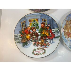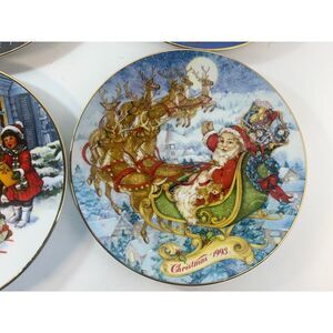 Beautiful set of 4 vintage Christmas collector plates from 1993-1995, featuring charming holiday scenes with 22k gold trim. Each plate showcases detailed festive artwork including carolers, Santa's sleigh, and Christmas tree decorating. These decorative porcelain plates make perfect holiday decor pieces or additions to a collector's display. Ideal for creating a nostalgic Christmas atmosphere or as special gifts for collectors.