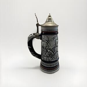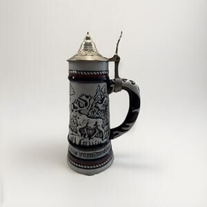 This vintage ceramic beer stein from Avon is a must-have for collectors of breweriana. Made in Brazil and Germany, this lidded stein features intricate designs and is signed 1976. The pewter lid adds to the stein's charm and makes it a unique addition to any collection.