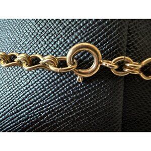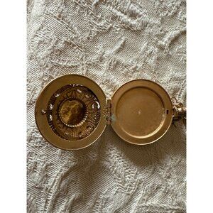 This vintage gold-tone locket necklace exudes elegance with its intricate design and rich brown gemstone centerpiece. The ornate detailing adds a touch of sophistication, making it a timeless accessory for those who appreciate classic beauty.