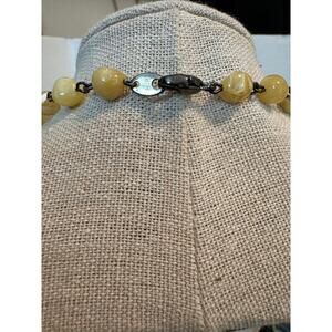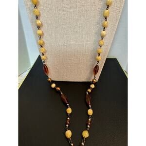 Vintage long necklace with natural colored tan, copper and brown plastic beads, 2 inch tassel, 28 inches long. Signed N.R which is an Avon designer. Preowned in great condition.