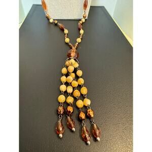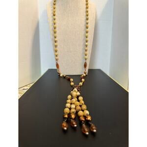 Avon Vintage Long Necklace with Natural Tan, Copper, and Brown Beads & Tassel
