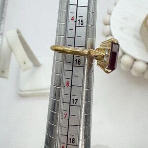 Avon Plaza IV gold-tone ring with an emerald-cut faux amethyst stone and two clear rhinestones on each side