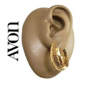 Avon wave curls horizontal lined hoops pierced earrings vintage gold tone textured raised design metal center band design finish open end wide round ring dangles. In very good vintage condition. Measures 1 inch in diameter 3/8 of an inch wide.