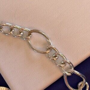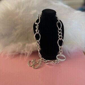 The chain necklace is bulky with one link accented with clear stones. No stones are missing and it has one link with minor discoloration close to under the ear where you would spray perfume. The earrings are accented with clear stones and none are missing or discolored.