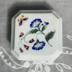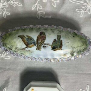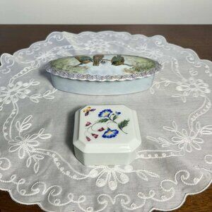 Order is for (2) porcelain lidded cache boxes. The Avon Gallery Originals is new in a 3” square box featuring blue & red flowers and a yellow and purple butterfly on the lid while the octagon shaped box has an interior divider. The scalloped edge 5-3/4”oval box features a hand painted trio of feathered friends signed by the artist. The delicate edge has a chip (see pic).