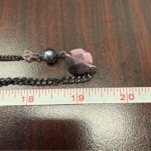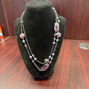 This Avon necklace features a stunning multi-strand design with a captivating mix of purple and silver beads. The asymmetrical placement of larger pink elements adds a unique touch, making it a versatile piece for any occasion. Its long length ensures it sits elegantly at the chest enhancing any outfit with its sophisticated allure.