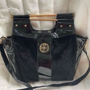 Avon the collection black velour and patent handbag bag with gold accents. Detachable crossbody strap. Pre owned in good used condition no tear normal wear see all pictures any questions please message.