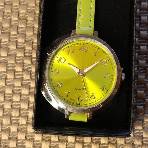 This is a super cute, new in box Avon watch. It has a shimmery apple green face, silver trim and apple green band. It does need a new battery.