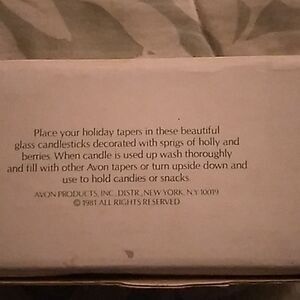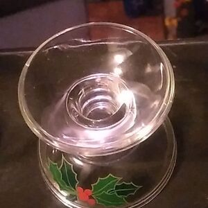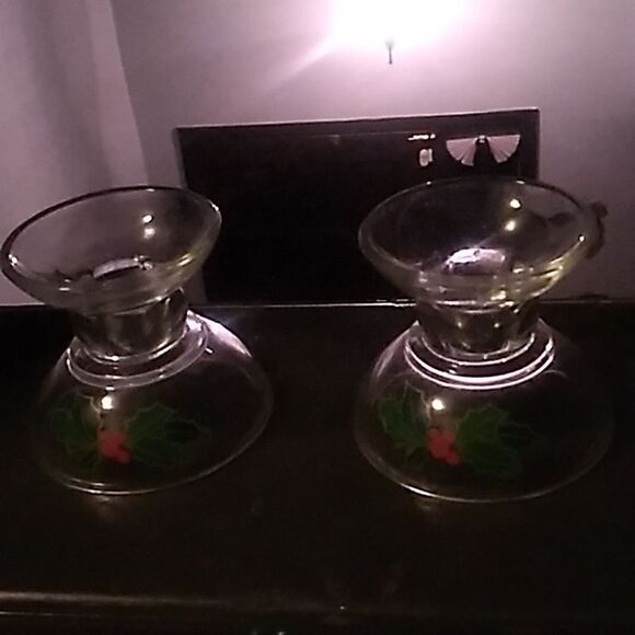 Pre-owned in good used condition. 1981 glass candlesticks decorated with sprigs of Holly and berties.Candles are not included. You can also turn upside down to hold candies or snacks.Comes in original box.