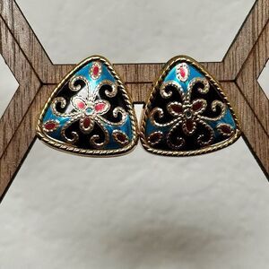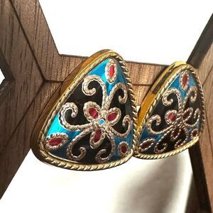 Rich colors combined with exotic design and bold triangular shape - Black, red & blue enamel-like finish with goldtone rope twist border and accents