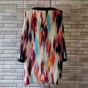 100% polyester lightweight silky feeling fabric with a colorful artsy print in a pullover design. Navy trim sround the collar and 3/4 sleeves.