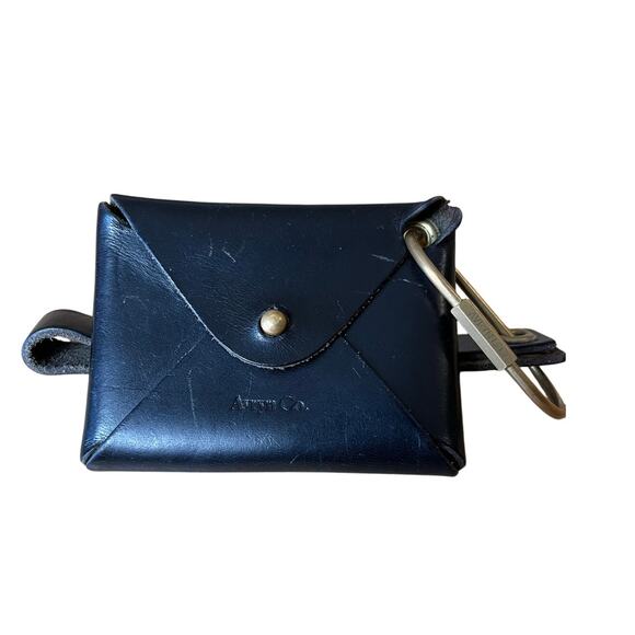 -Description: Avryn Co., small coin bag with strap. Black in color. Minor scratches from wear. In good condition.