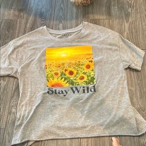 This short sleeve t-shirt features a classic crew neck and a vibrant graphic design on the front, showcasing a colorful sunset and sunflowers. The light heather gray color adds a casual touch, making it perfect for everyday wear. EUC no damage, stains or odor. smoke free home.