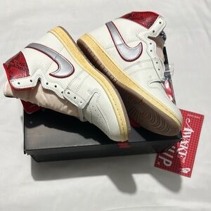 University Red High top dons an off-white leather upper, accented with a metallic silver Swoosh outlined in red trim Awake’s ‘A’ logo is stitched on the lateral forefoot, while the iconic wings logo is embossed on a padded collar built with crimson snakeskin. An aged finish is applied to the midsole, reinforced underfoot by a durable tan rubber outsole. Men’s size 8.5 Excellent condition NWT comes in original box, comes with jumpman keychain and airship booklet. Authentic