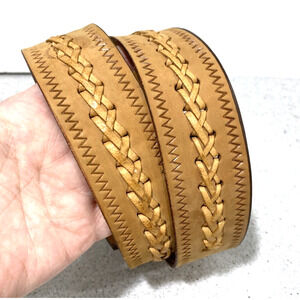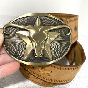 Award Design Metals Buckle done in burnished gold tone metal with a Longhorn & Star motif on the front - large oval shape with texture and fine details in the design. Currently on a tan leather belt that features a woven braided detail, light tooling and zigzag top-stitching. Both pieces are in excellent vintage condition - 1980/1990 era - very light wear - no damage or flaws.