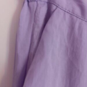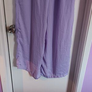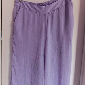 These pretty lavender pants are made of 100% recycled polyester. They feature a flat band front, elastic back and side pockets.