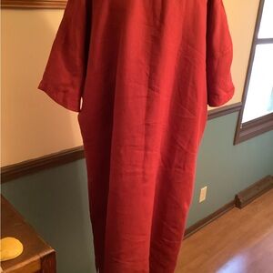 This boho style dress has pockets. No fabric or care tags, but is 100% linen. Pit to pit measures 26” and length is 47”. Thanks for looking!