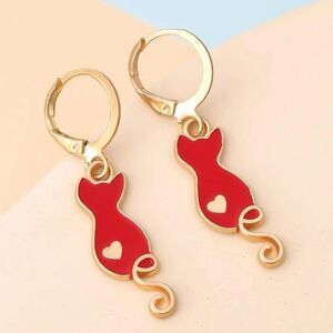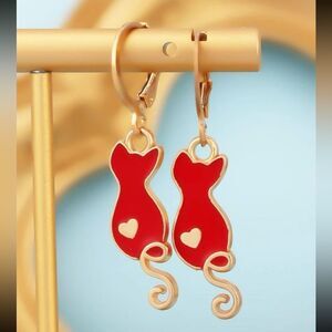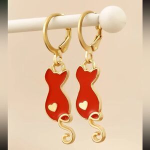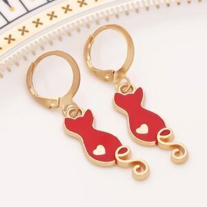🐈 Awesome Red Kitty Heart Artsy Hoop Dangle Pierced Earrings 🐈⬛