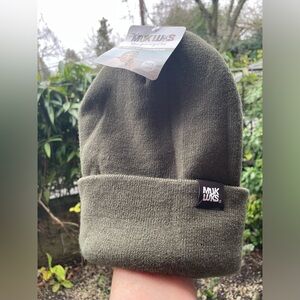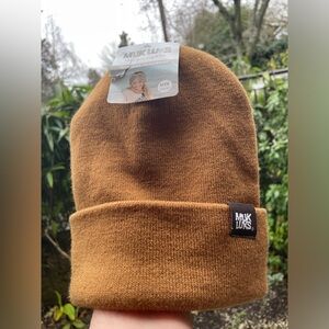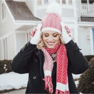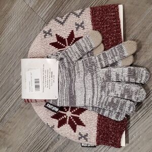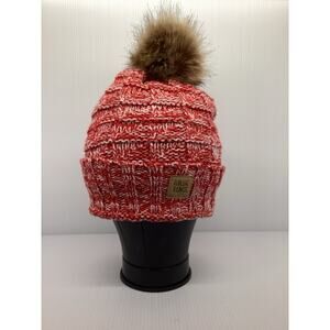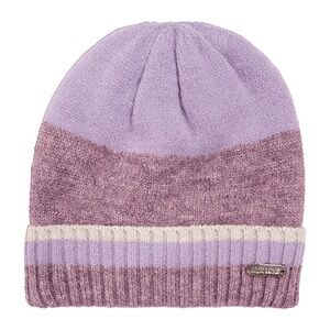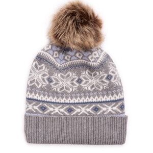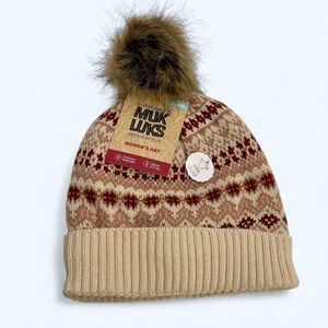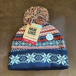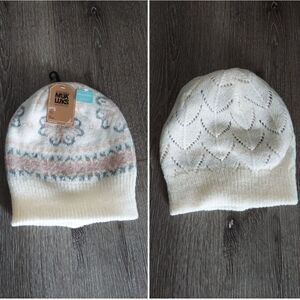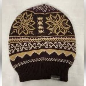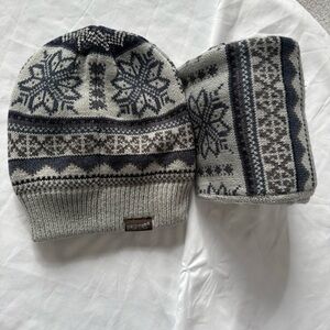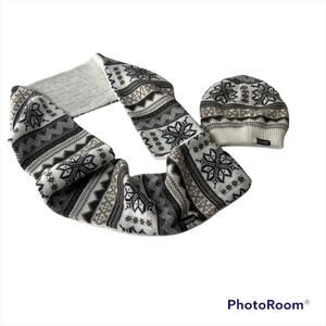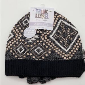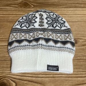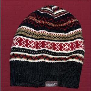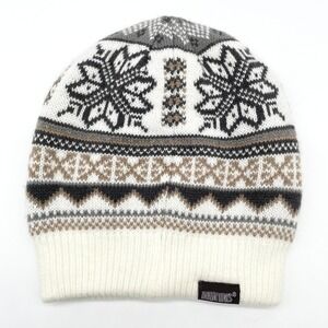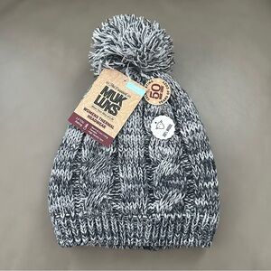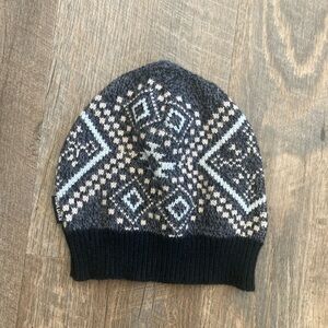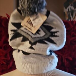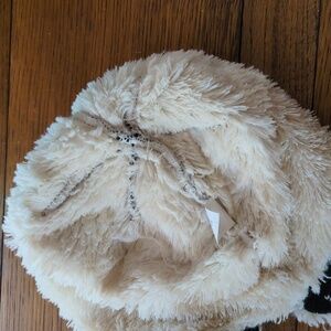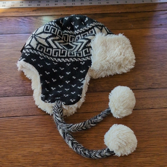 warm black and cream hat with ear laps and chin ties. soft fleecy feel. clean.