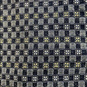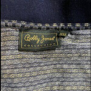 Vintage soft knit Bobby Jones golf polo in geometric blue/white/tan print, blue collar and stitched golfers on underside of button closure. Made in Italy. Excellent preowned condition. No rips, holes, stains or fading.