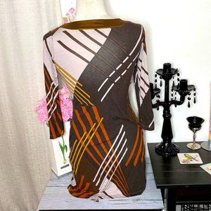 Pretty geometric design dress with satin neckline trim and 3/4 length sleeves. Soft and stretchy.