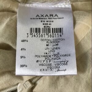 Step into effortless elegance with this Axara Paris mini cocktail dress, European size 40 (US Medium/8). Crafted from a luxurious linen blend (48% cotton, 4% linen, 9% polyamide, 39% viscose), the fabric features a unique tweed-to-linen look with subtle metallic gold threads woven throughout, adding a refined sparkle to the textured black and white base. The faux wrap bodice is complemented by adjustable rope-look spaghetti straps for a customizable fit, while the defined waist and pleated bubble skirt create a flattering, feminine silhouette. Fully lined for comfort and structure, this dress closes with a discreet back zip. Perfect for cocktail parties, vacations, beach dinners, cruises, or any special occasion where you want to shine. Machine care details unavailable; handle with care. AI model for fit reference only; actual item may vary slightly.