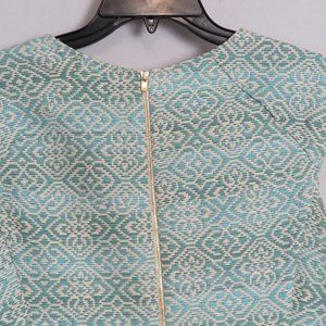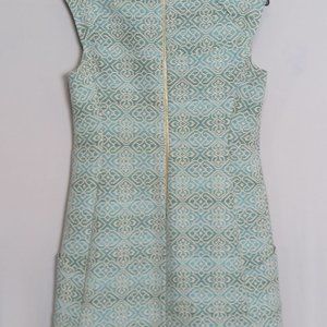 Axara Paris Mint Ivory Jacquard V-Neckline Shift Size 38 (US 8). Bust is 35", waist is 33", hips are 39" and rear center length is 32.5". 49% cotton, 37% polyester and 14% viscose fully lined with silk. Two front diagonal hip pockets. Rear exposed gold zipper closure. "V" neckline. Versatile style that can be worn for business, dress or travel. Impeccable quality and style from this French designer. Excellent, like new condition. MSRP $350