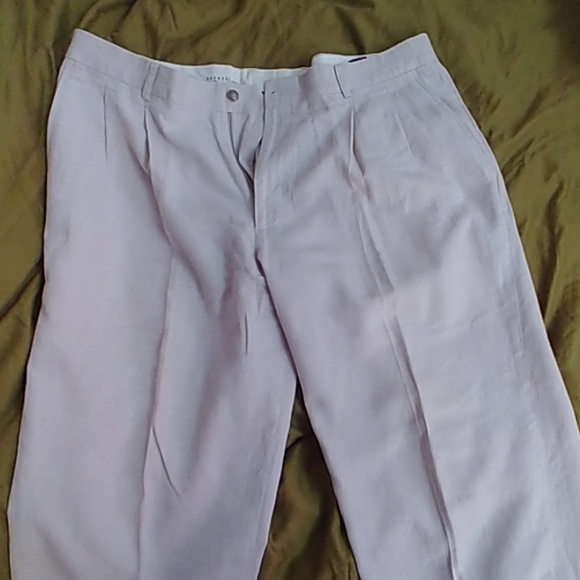 Tan/light brown pants very light fabric. Can go to the beach with them. Husband only worn once. 38/30